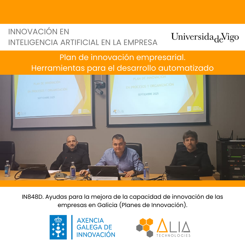 La ponencia, titulada “Plan de innovación empresarial. Herramientas para el desarrollo automatizado”, fue impartida por Brais Saco y César Parguiñas de Alia Technologies, junto a Diego Arias de la consultora Zakiobi. Durante la sesión, se compartieron los avances y aprendizajes del plan, así como su impacto en los procesos internos y en la estrategia tecnológica de la compañía.